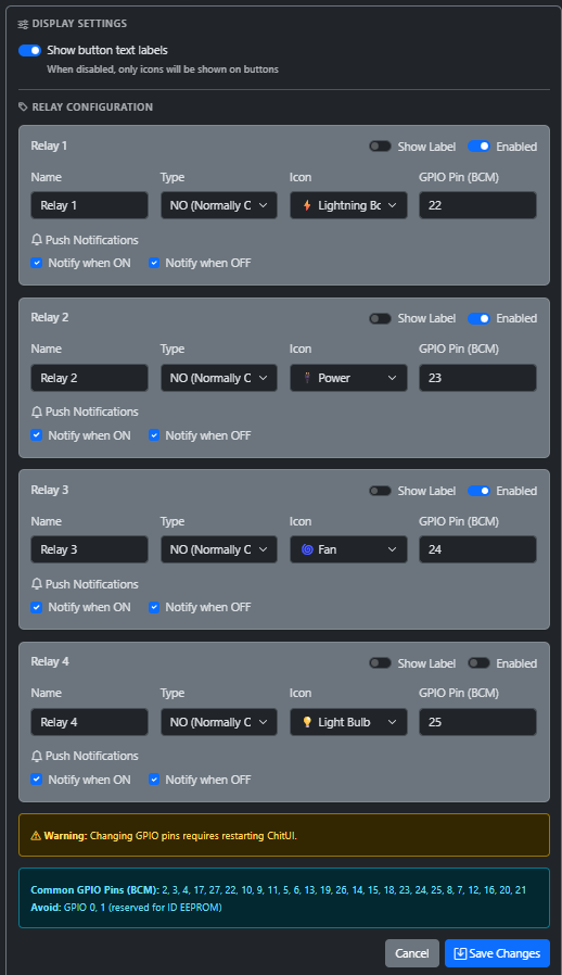 - Settings Modal - Configure relay names and view GPIO pin assignments